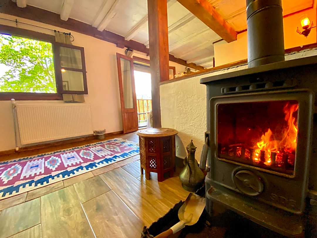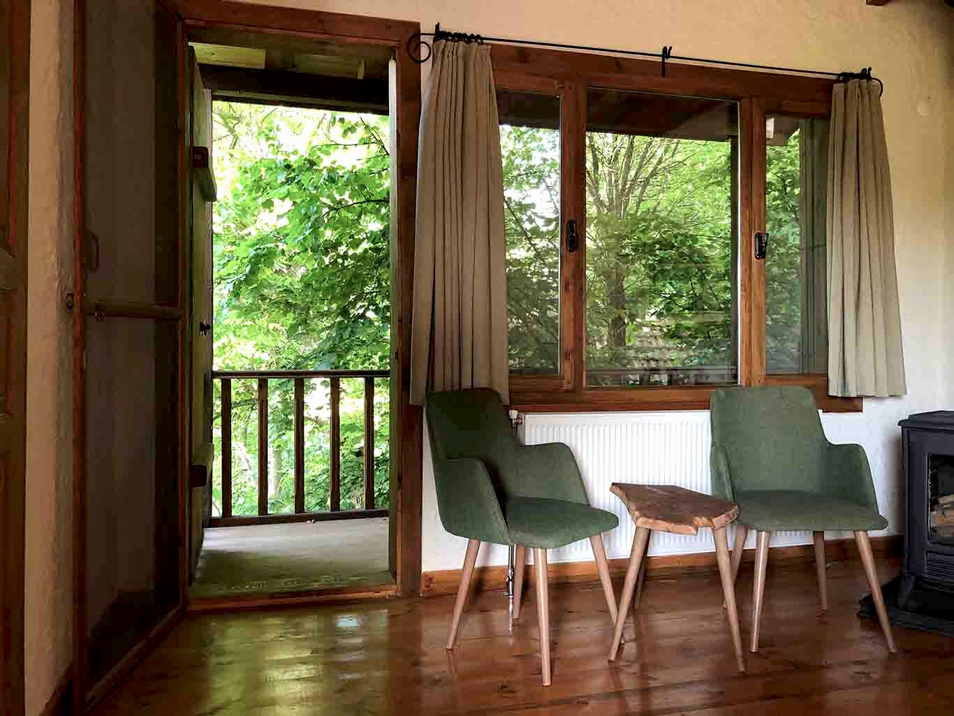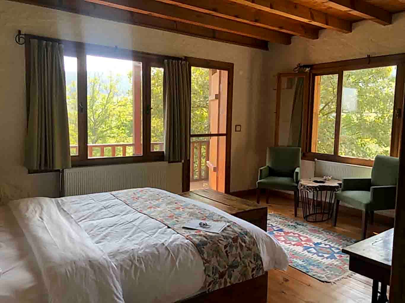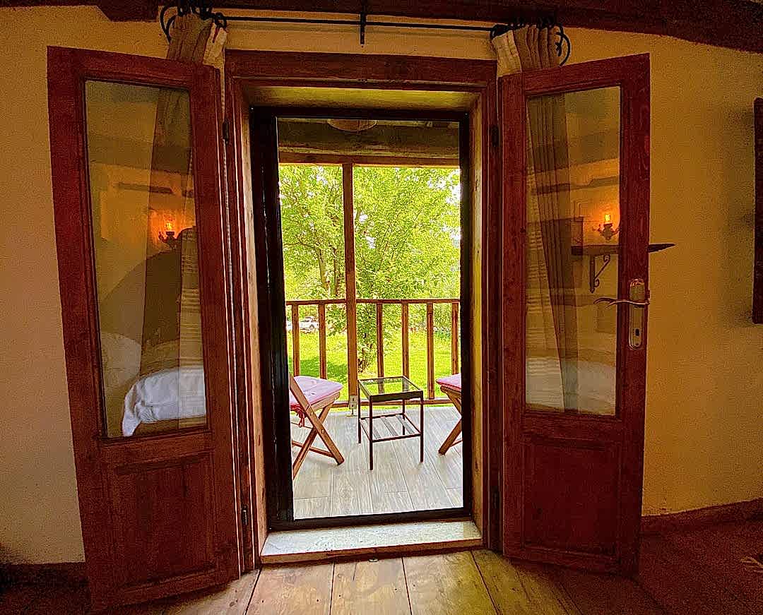 Taş evimizin 1. Katında yer alan odamız, camından ve büyük balkonundan etrafımızı çevreleyen ormana doğru sonsuz bir manzara sunar.. Balkonuna uzanan meşe ağacında, lezzetli meşe palamutlarının peşinden koşan sincaplara rastlamanız mümkün..