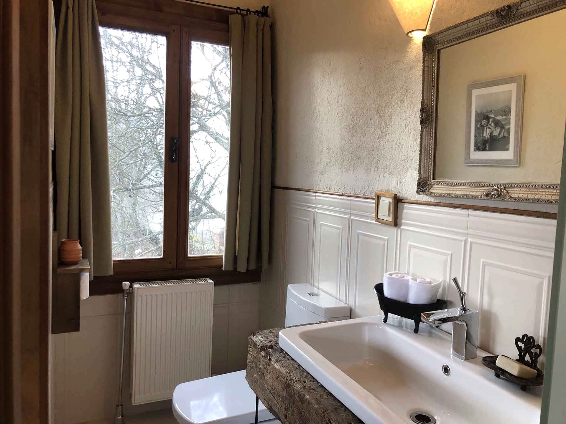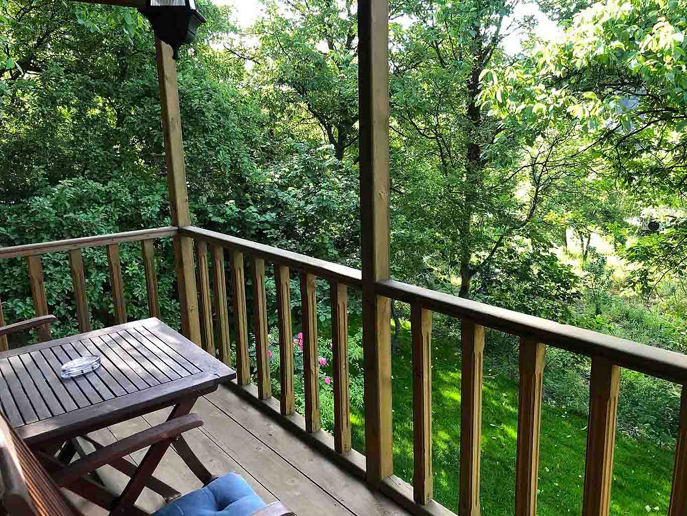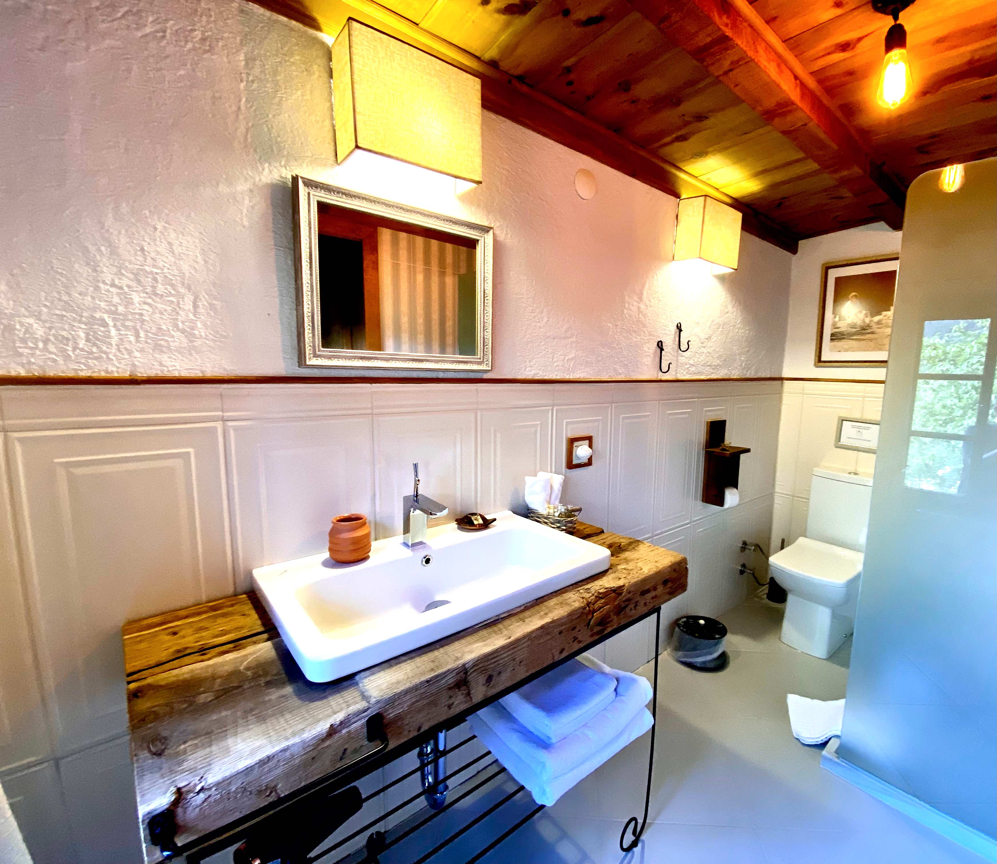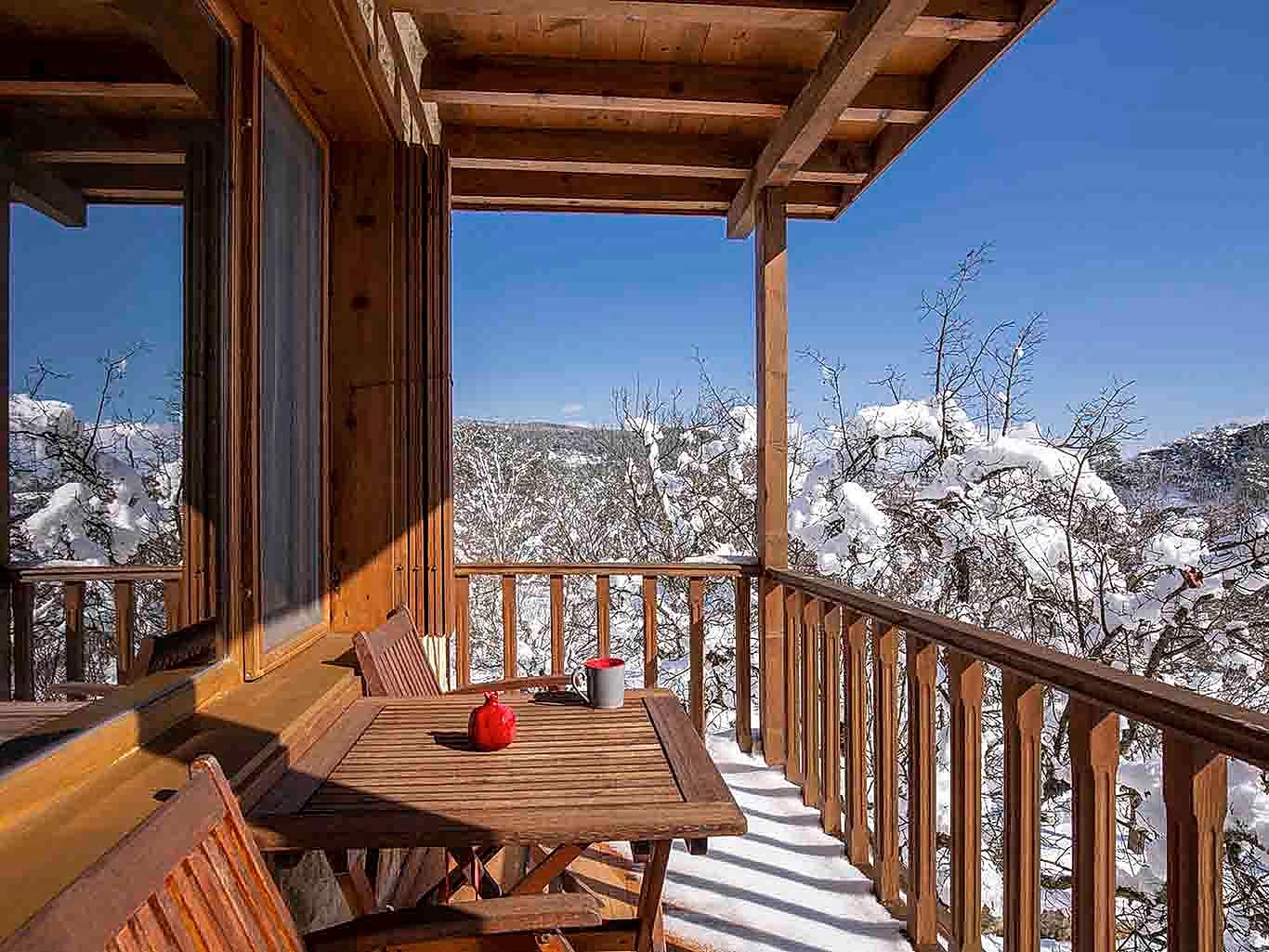 Taş evimizin 1. Katında yer alan odamız, camından ve büyük balkonundan etrafımızı çevreleyen ormana doğru sonsuz bir manzara sunar.. Balkonuna uzanan meşe ağacında, lezzetli meşe palamutlarının peşinden koşan sincaplara rastlamanız mümkün..